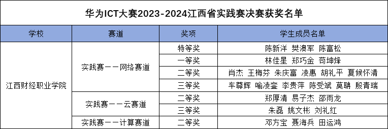 在華為中國ICT大賽2023-2024江西省賽實(shí)踐賽中,我校獲得華為中國大學(xué)生ICT大賽2023-2024江西省決賽——網(wǎng)絡(luò)賽道高職組特等獎(jiǎng)、網(wǎng)絡(luò)賽道高職組一等獎(jiǎng)、網(wǎng)絡(luò)賽道高職組二等獎(jiǎng)、網(wǎng)絡(luò)賽道高職組三等獎(jiǎng)、云賽道高職組二等獎(jiǎng)、云賽道高職組三等獎(jiǎng)、計(jì)算賽道高職組二等獎(jiǎng)。