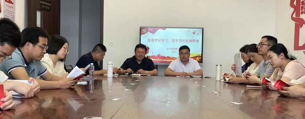 為貫徹落實江西財經職業學院委員會印發《關于在全校開展黨紀學習教育的實施方案》的通知精神,扎實開展黨紀學習教育,會計學院教工黨支部于5月21日下午在一教B308室召開黨紀學習教育專題黨課——《加強黨紀學習,筑牢黨的紀律防線》,黨課由教工支部書記楊燕授課,黨總支書記張家順主持,全體黨員教師參加。