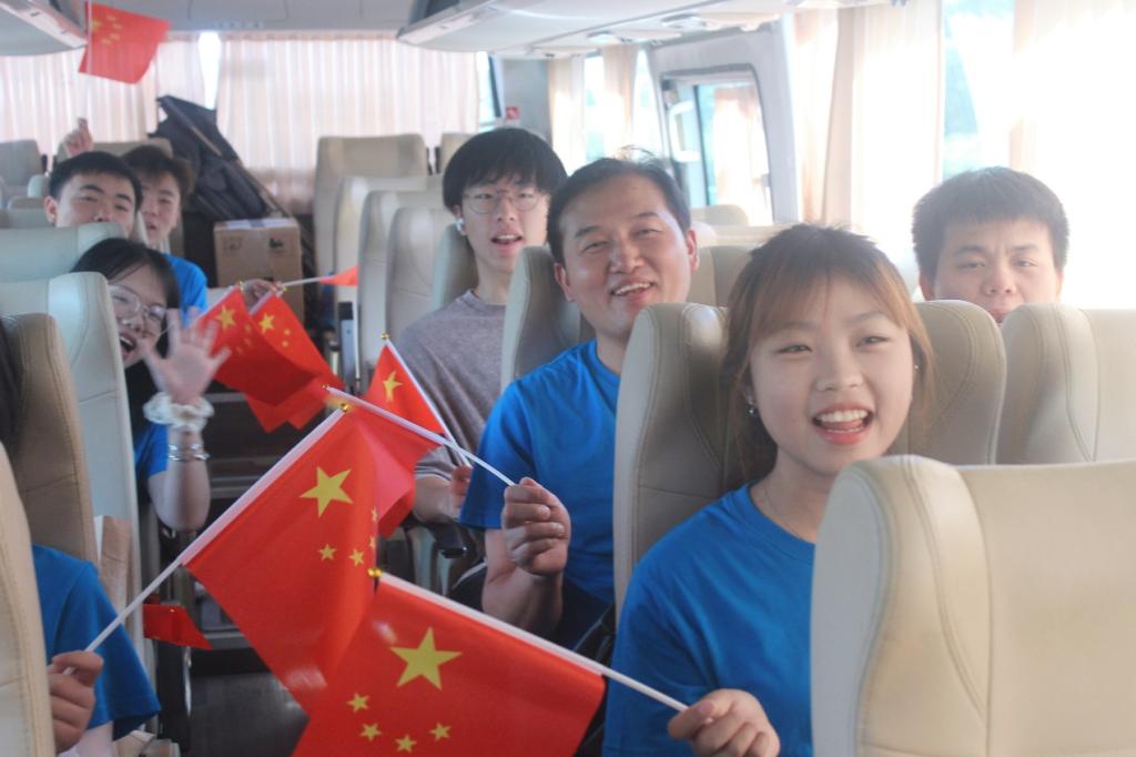 圖為:“潯夢(mèng)楊州”社會(huì)實(shí)踐隊(duì)成員在前往實(shí)踐地的路上開(kāi)心的唱著紅歌。