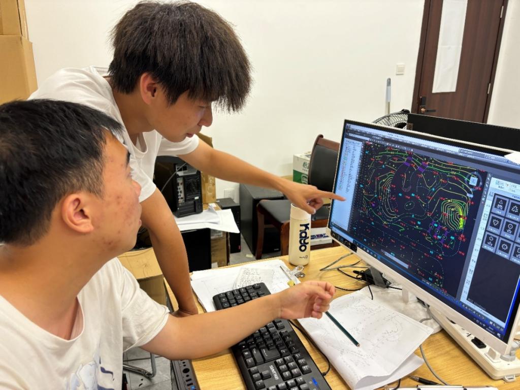 圖為:“潯夢(mèng)楊洲”社會(huì)實(shí)踐隊(duì)成員交流合作修改鄉(xiāng)村薪火園圖。