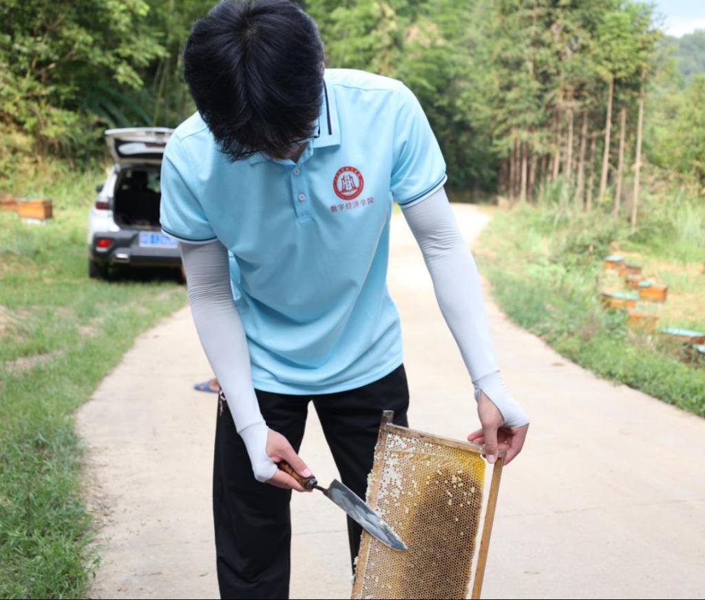 下午,實踐隊在中蜂養殖場開啟戶外直播,由江西省養蜂研究所劉鋒博士為實踐隊員和在線網友科普蜜蜂的相關知識,并在在蜂農的指導下實踐隊員親自體驗了割蜜、搖蜜全過程。