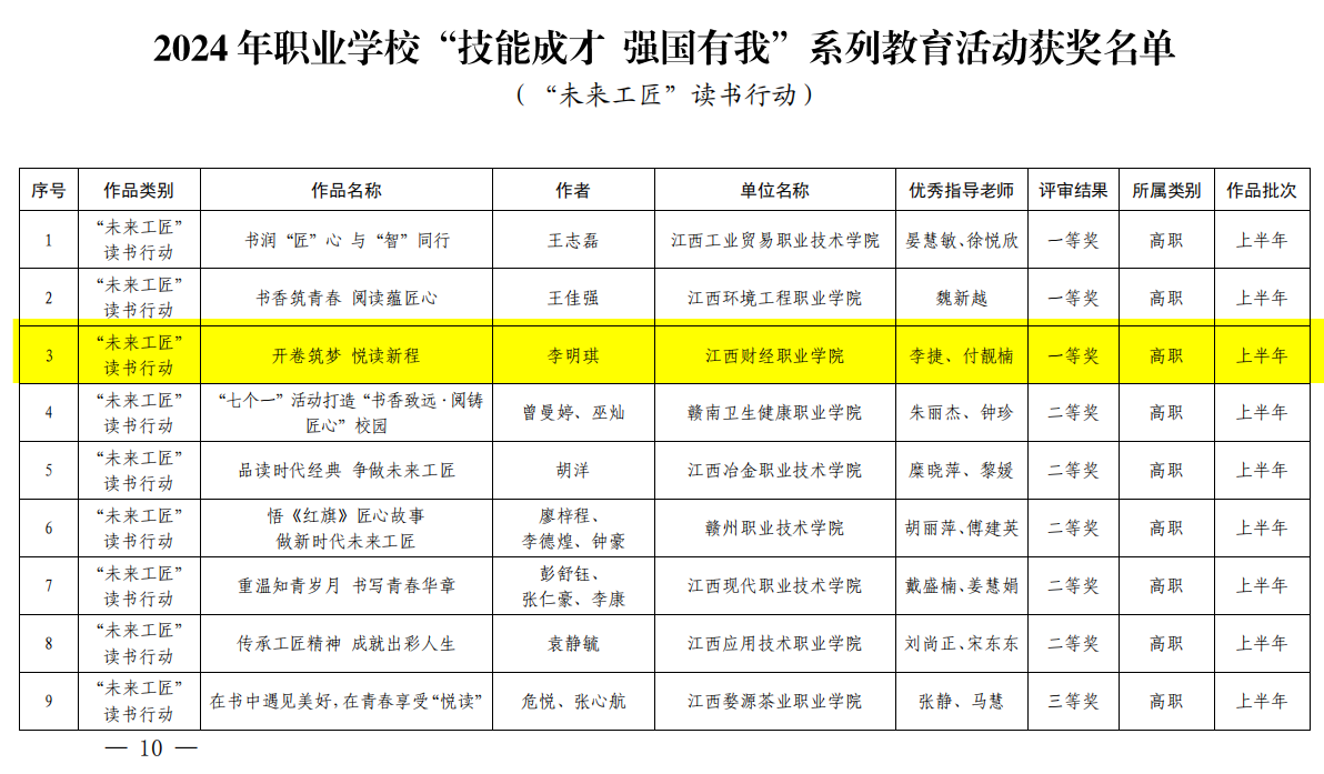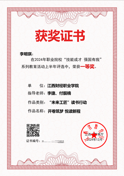 此次系列教育活動按照上半年、下半年作品上報情況,由江西省教育廳分別組織專家對作品進行評審。經過評審,城鄉建設院李捷和付靚楠老師指導,李明琪同學上報的作品《開卷筑夢 悅讀新程》獲得“未來工匠”讀書行動一等獎。