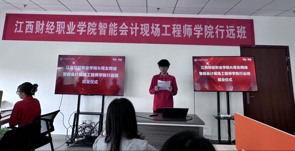 2025年4月25日,江西財經職業學院智能會計現場工程師“行遠班”結業儀式在用友產業園(南昌)順利舉辦。會計學院院長萬凱、副院長齊潔,用友集團全球遠程交付中心總經理李佳文、新道科技華東區總經理丁立波、江西分公司服務總監彭佳琦、以及校企項目導師代表,與全體學員共同見證了這一產教融合的重要成果。儀式由“行遠班”學生代表呂佳航主持。