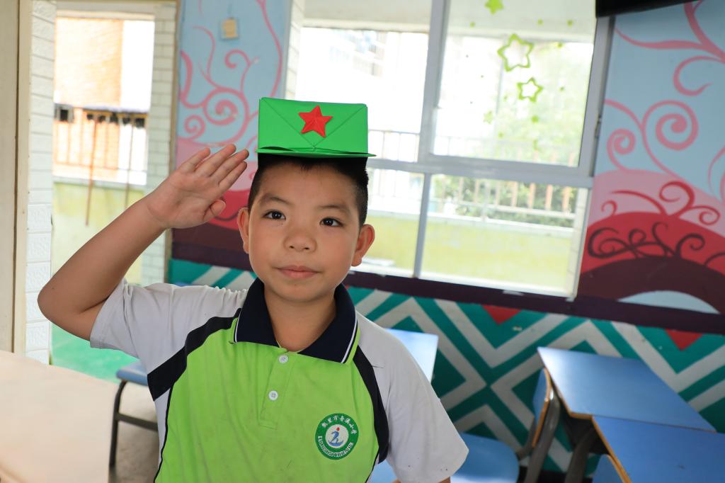 隊員們耐心地教孩子們折軍帽,簡單的折紙過程充滿了儀式感。他們一邊用普通話耐心講解折紙步驟,一邊講述軍帽所代表的軍人精神和紅色意義。孩子們認真地學習折紙,小心翼翼地折好每一個角,戴上親手折好的軍帽,眼神中滿是自豪與堅定。小小的軍帽,承載著孩子們對軍人的崇敬,更寄托著他們立志傳承紅色精神的美好愿望。