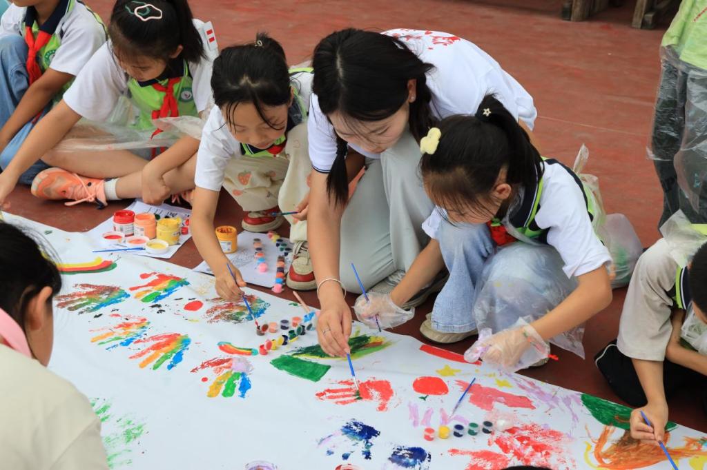 操場上,隊員們和孩子們圍坐成圈,一邊交流著兩地特色,一邊用畫筆描繪心中的美好圖景:江西的瓦罐湯與貴州的酸湯魚相映成趣,南昌滕王閣與荔波小七孔遙相呼應,兩地獨特的歷史故事與民族服飾躍然紙上。孩子們專注地勾勒著每一筆線條,眼中閃爍著對家鄉文化的自豪;隊員們細心地填充每一處色彩,傳遞著民族團結的真摯情誼。這幅逐漸成型的斑斕畫卷,不僅記錄了兩地文化的交融,更成為促進民族交流的生動載體。