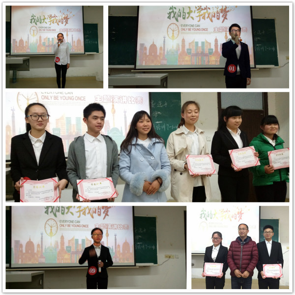 2016年3月18日晚7:00,經(jīng)濟(jì)貿(mào)易學(xué)院在綜合樓階梯教室三舉行了“我的大學(xué)。我的夢(mèng)”主題演講比賽。此次比賽經(jīng)過(guò)了預(yù)賽環(huán)節(jié),共有19名同學(xué)表現(xiàn)突出進(jìn)入決賽。在決賽環(huán)節(jié),參賽選手用他們真摯的語(yǔ)言、飽滿的激情、自信的表現(xiàn)詮釋了“我的大學(xué)夢(mèng)”,將個(gè)人理想與祖國(guó)發(fā)展緊密結(jié)合起來(lái),展示了當(dāng)代大學(xué)生良好的精神風(fēng)貌和對(duì)美好未來(lái)的渴望,也表達(dá)了學(xué)生追夢(mèng)的決心與信心。經(jīng)過(guò)激烈角逐和評(píng)委們的認(rèn)真評(píng)定,陳茹夢(mèng)、萬(wàn)偉強(qiáng)等8名同學(xué)分獲一、二、三等獎(jiǎng)。經(jīng)濟(jì)貿(mào)易學(xué)院黨政辦公室主任崔曉慧老師為獲獎(jiǎng)選手頒發(fā)了獎(jiǎng)狀與獎(jiǎng)品。