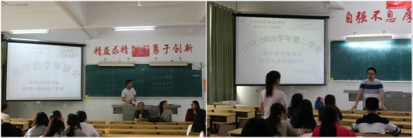第三階段——以教研室為單位召開的教學座談會。5月5日下午,以教研室為單位分別在教學樓408、409、410、411教室召開了期中教學座談會。此次座談會主要由各專業教師面對學生代表,各教研室主任及各課程組教師代表與我院14、15級近200名學生代表共同參加了此次活動。座談會上氣氛熱烈,同學們暢所欲言,分別圍繞課程設置、教學內容、教學方法與方式、教學效果、職業資格證書考試等主題提出了自己的困惑與建議。與會的教師認真聽取了意見并進行了詳細的記錄與解答。針對部分同學所提出的企業會計業務核算、企業財務管理、財務報表審計、成本核算實務、財稅信息化及會計基礎實訓等課程的學習方法問題,與會的領導、老師也與同學們進行了深入的交流并提出了許多寶貴的建議。