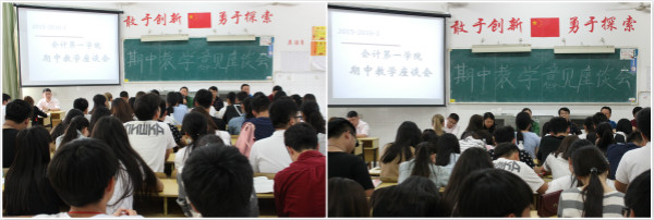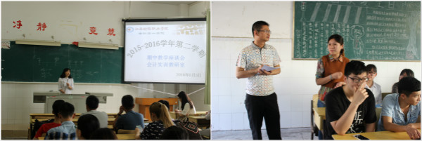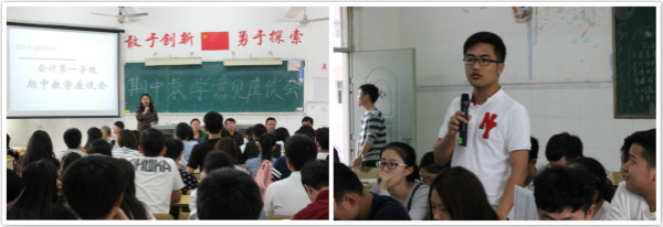 第二階段——學院教學座談會。5月4日下午會計第一學院在教學樓408教室組織召開了2015-2016學年第二學期期中教學座談會,學院黨政班子領導和各教研室主任出席座談會,來自學院14、15級各班120余名學生代表參加了座談會。座談會上,與會學生代表主要圍繞學院目前在課堂教學、教學安排、教學條件、教學管理等幾個方面存在的問題,積極發言,認真反饋平時收集、了解到的教學相關的信息。學生代表們在發言中對絕大部分教師的教學給予了充分的肯定,對個別教師在教學過程中存在的不足提出了意見和建議,同時也對學院教學條件、教學管理方面給出了建議。