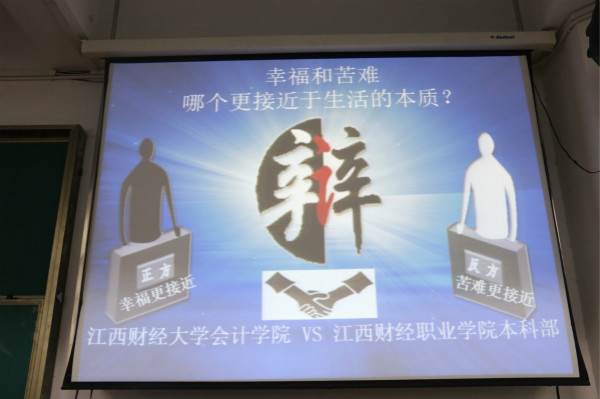 本次辯論賽的題目為:幸福和苦難哪個(gè)更接近于生活的本質(zhì)。正方:江西財(cái)經(jīng)大學(xué)會(huì)計(jì)學(xué)院代表隊(duì),所持觀點(diǎn)是“幸福更接近于生活的本質(zhì)”,反方:江西職業(yè)學(xué)院本科部代表隊(duì),認(rèn)為“苦難更接近于生活的本質(zhì)”。兩方就此展開(kāi)了激烈而巧妙的辯論博弈。在開(kāi)篇立論環(huán)節(jié)中,兩支隊(duì)伍或澎湃或穩(wěn)重的風(fēng)格令人耳目一新。正方指出:每個(gè)生命個(gè)體的存在,都是為了追求人生的幸福和希望;反方辯手則認(rèn)為,人生的目標(biāo)不能等同生活的本質(zhì)。接下來(lái),雙方針?shù)h相對(duì),你來(lái)我往,辯論的氣氛迅速升溫,場(chǎng)內(nèi)不時(shí)掌聲雷動(dòng)。在自由辯論環(huán)節(jié),辯手們圍繞辯題,引經(jīng)據(jù)典,旁征博引,將自己精湛的應(yīng)變能力和辯論技巧發(fā)揮地淋漓盡致,把辯論氣氛步步推向高潮。總結(jié)陳詞環(huán)節(jié),雙方四辯各自針對(duì)對(duì)方邏輯上的漏洞逐一回?fù)簦M力一搏。正方四辯從容鎮(zhèn)定、娓娓道來(lái)的精彩發(fā)言更成為整場(chǎng)比賽的一大亮點(diǎn)。整場(chǎng)辯論賽在熱烈的氣氛中落下帷幕。
