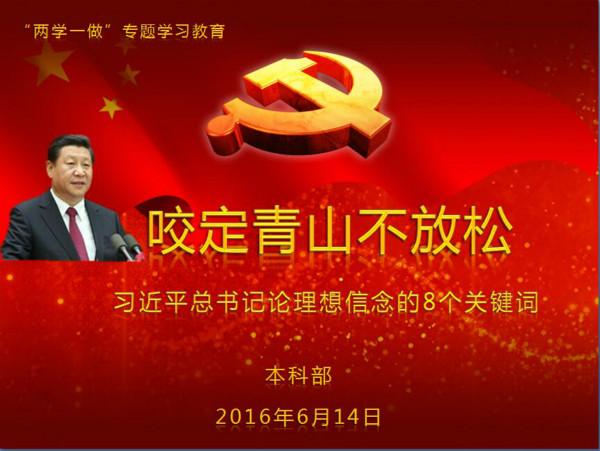 根據我校《關于在全校黨員中開展“兩學一做”學習教育實施方案》第一專題的總體部署,為真正把黨的思想政治建設抓在日常、嚴在經常,使“兩學一做”學習教育常態化,2016年6月14日下午4點半,本科部黨總支召集全體師生黨員在綜合樓階梯教室(二)觀看了專題片《咬定青山不放松---習近平總書記論理想信念的八個關鍵詞》。專題片以“精神上的鈣”“信仰的味道”“金剛不壞之身”“營養劑”“溫水煮青蛙”“三種境界”“革命理想高于天”“不忘初心,方得始終”8個關鍵詞,深刻闡釋了習近平總書記系列重要講話蘊含的獨特文風、堅定信仰和精神力量。