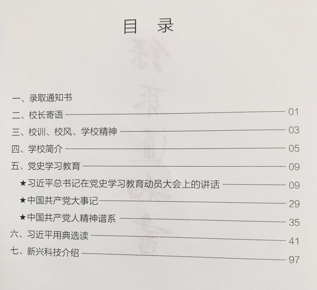 輕輕翻開,手冊包含了七個板塊的內容,分別是錄取通知書、校長寄語、校訓校風、學校精神、學校簡介、黨史學習教育、《習近平用典》選讀、新興科技介紹。不僅有校長的寄語諄諄教誨,還有我們的校訓校風,緊跟時代腳步,重視黨史學校教育,重視培育科技人才。