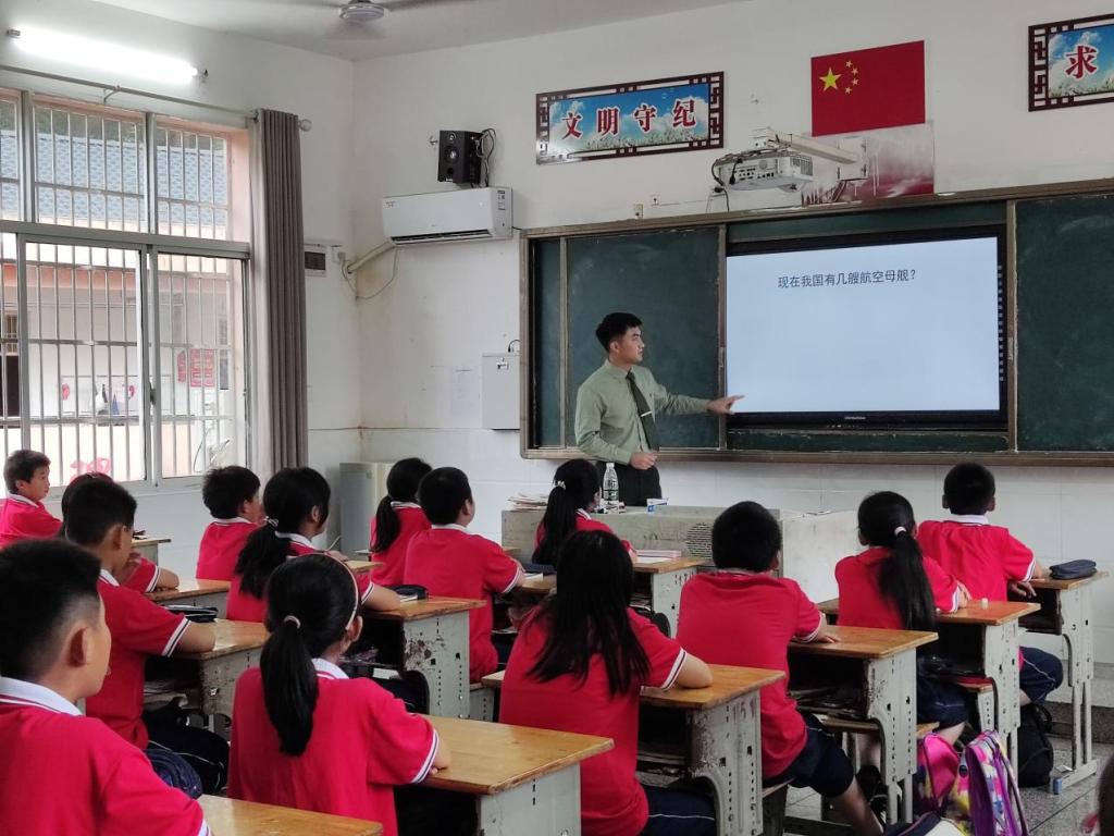 圖為羅少炫給學生們播放建國70周年閱兵式。中國青年網通訊員 龔爾潔 攝
