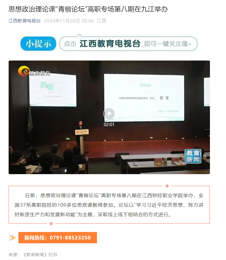 (江西教育電視臺報道)思想政治理論課“青椒論壇”高職專場第八期在九江舉辦