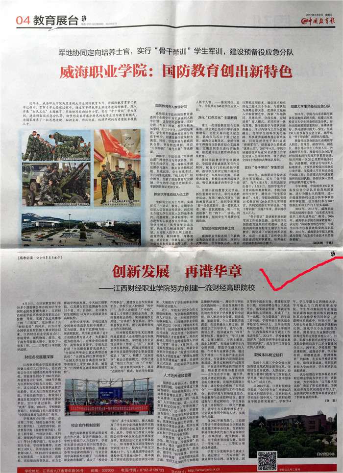 8月2日,《中國教育報》在04版“教育展臺”專欄刊發(fā)《創(chuàng)新發(fā)展 再譜華章——江西財經(jīng)職業(yè)學(xué)院努力創(chuàng)建一流財經(jīng)高職院?!芬晃?,報道我校深化教育教學(xué)改革,人才培養(yǎng)工作取得顯著成效。