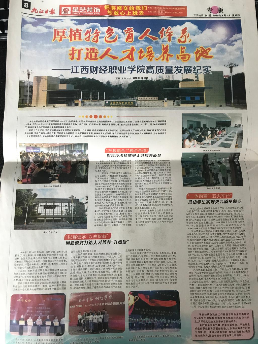 8月1日,《九江日?qǐng)?bào)》整版報(bào)道我校創(chuàng)新人才培養(yǎng)模式,打造專業(yè)特色品牌先進(jìn)經(jīng)驗(yàn)。