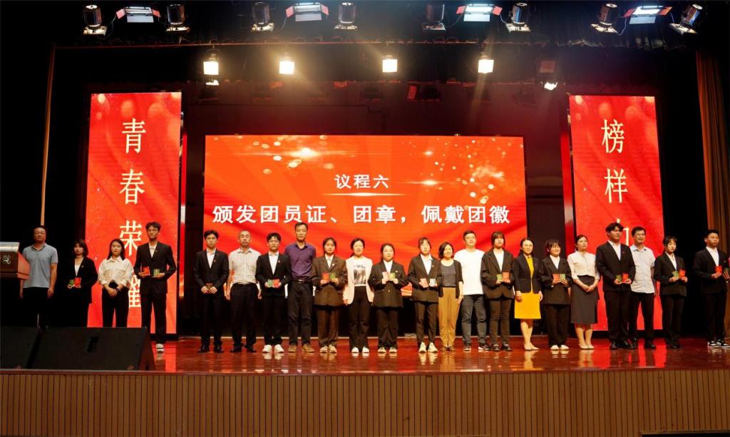 校團委副書記廖國臣、徐穎分別宣讀了2022年度共青團工作優秀集體和先進個人表彰文件、2023年新團員名單。與會校領導及職能部門領導分別為受到表彰的先進集體及個人頒獎,各黨總支負責人為新團員頒發了團員證并佩戴團徽。